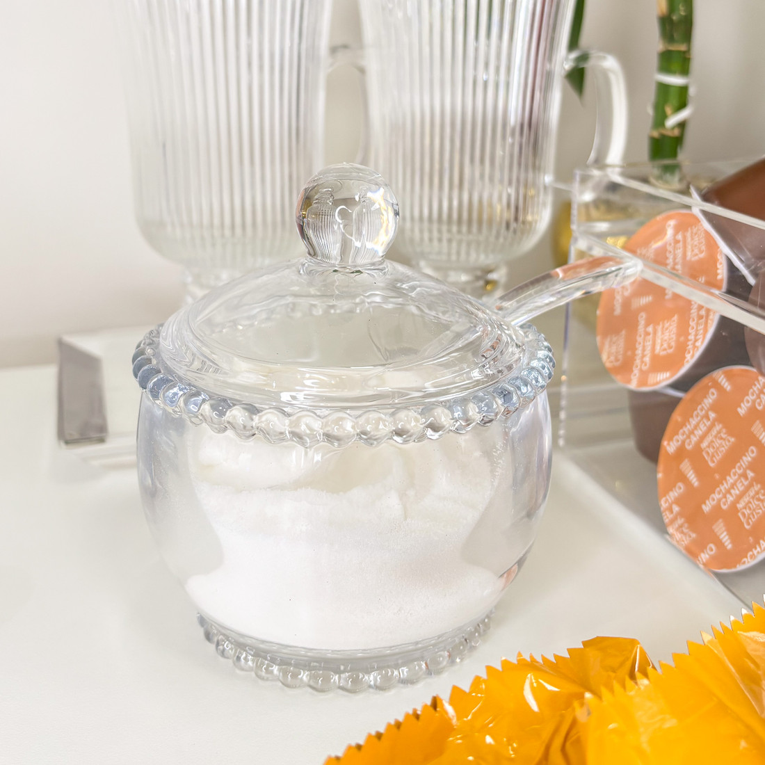 AdicionarUm detalhe pequeno que faz toda a diferença na mesa. O Açucareiro com Colher Cristal Pearl une funcionalidade e elegância, trazendo um toque clássico e refinado para o momento do café ou chá.