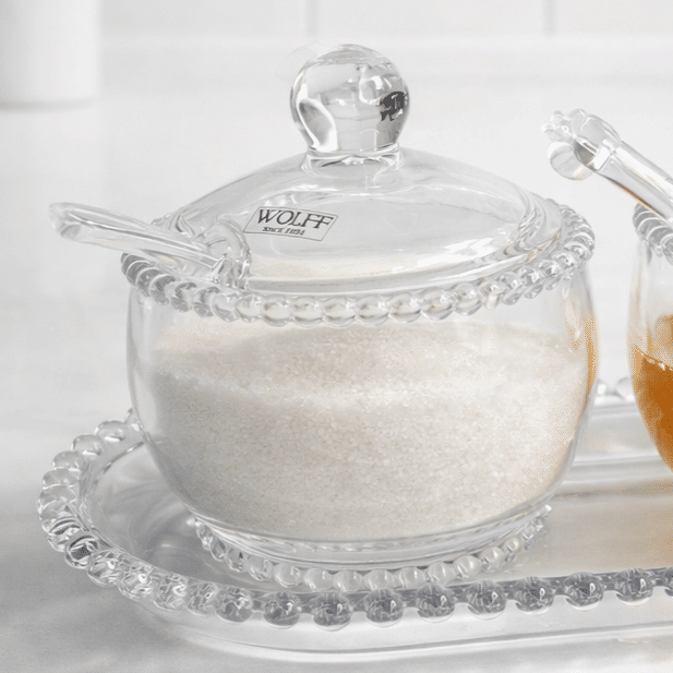 Produzido em cristal com acabamento em relevo no estilo pearl, ele valoriza a composição da mesa posta e facilita o uso no dia a dia. Acompanha colher, garantindo praticidade e harmonia no conjunto.