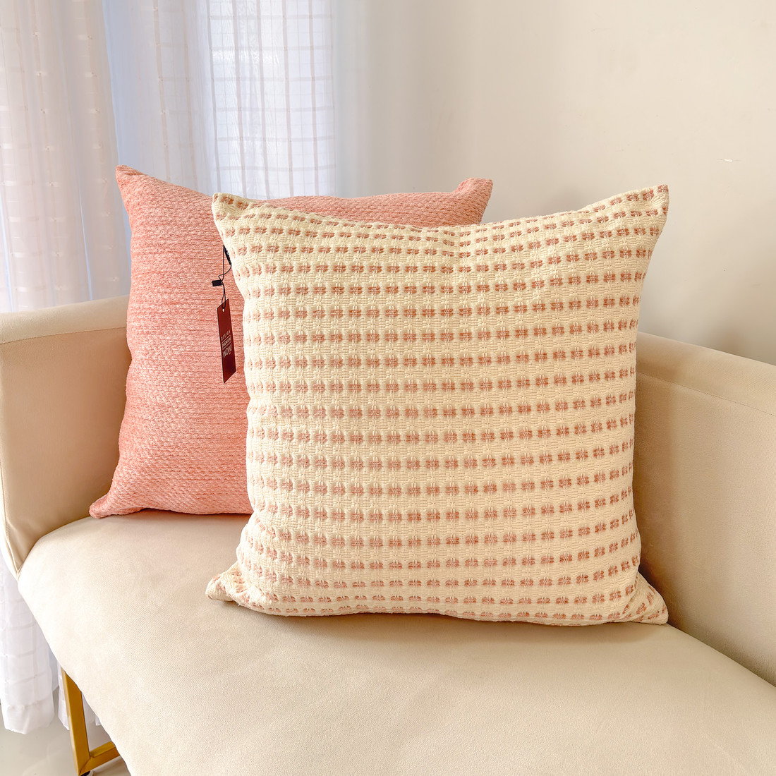 Elegante e atemporal, a almofada Toulon combina base cru com delicados pontos rosé em desenho quadriculado, criando um efeito texturizado sofisticado que ilumina o décor sem excessos. O jacquard de alta gramatura oferece toque macio e excelente estrutura, enquanto o enchimento já incluso garante volume generoso e caimento impecável — perfeito para sofás, poltronas ou a composição da cama com ar de hotel boutique.