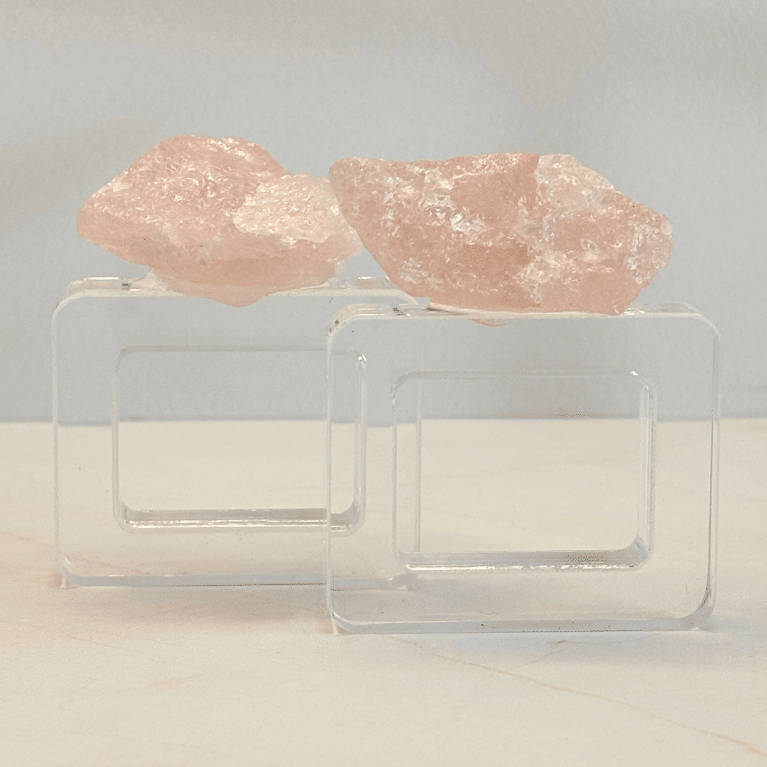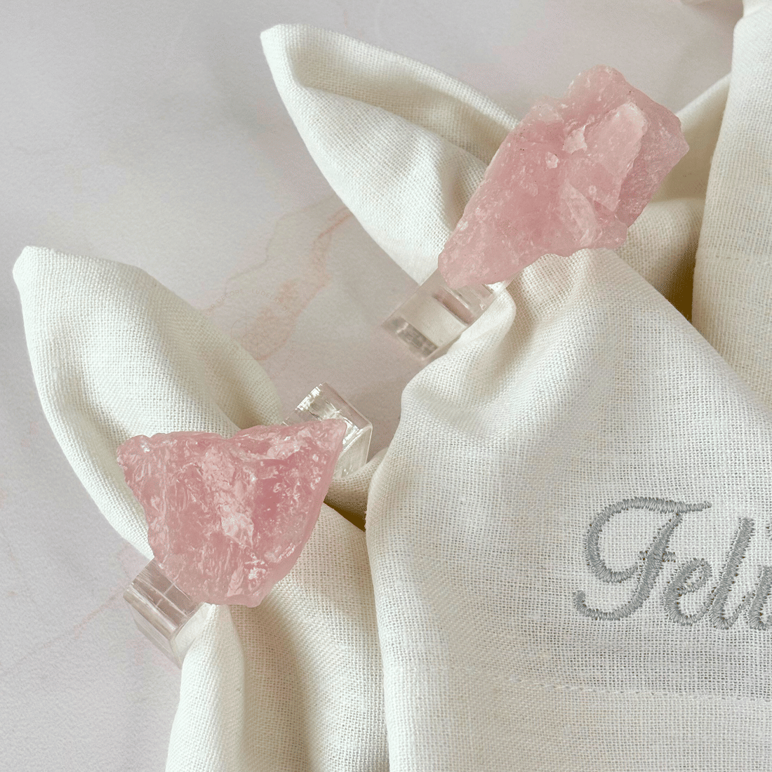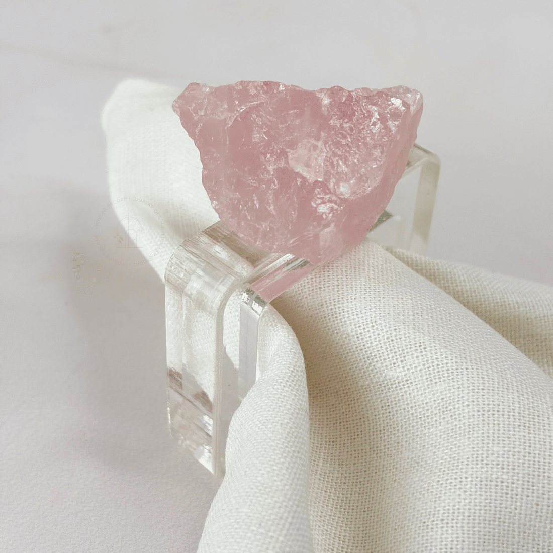 Anel de Guardanapo em Acrílico com Pedra Natural de Quartzo Rosa – uma peça que une sofisticação e significado à sua mesa posta. O acrílico transparente realça a beleza bruta e delicada do quartzo rosa, conhecido como a pedra do amor e da harmonia.