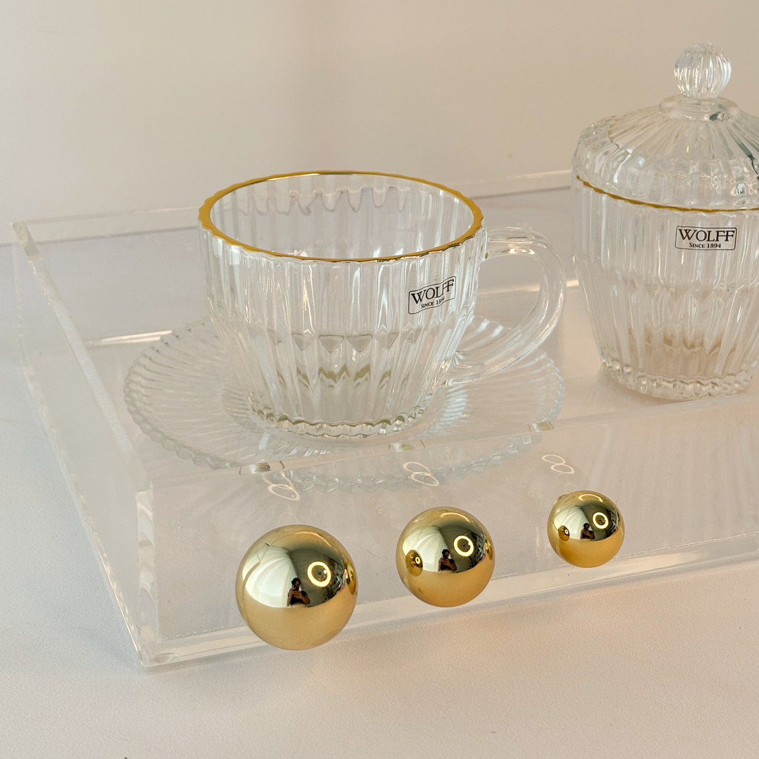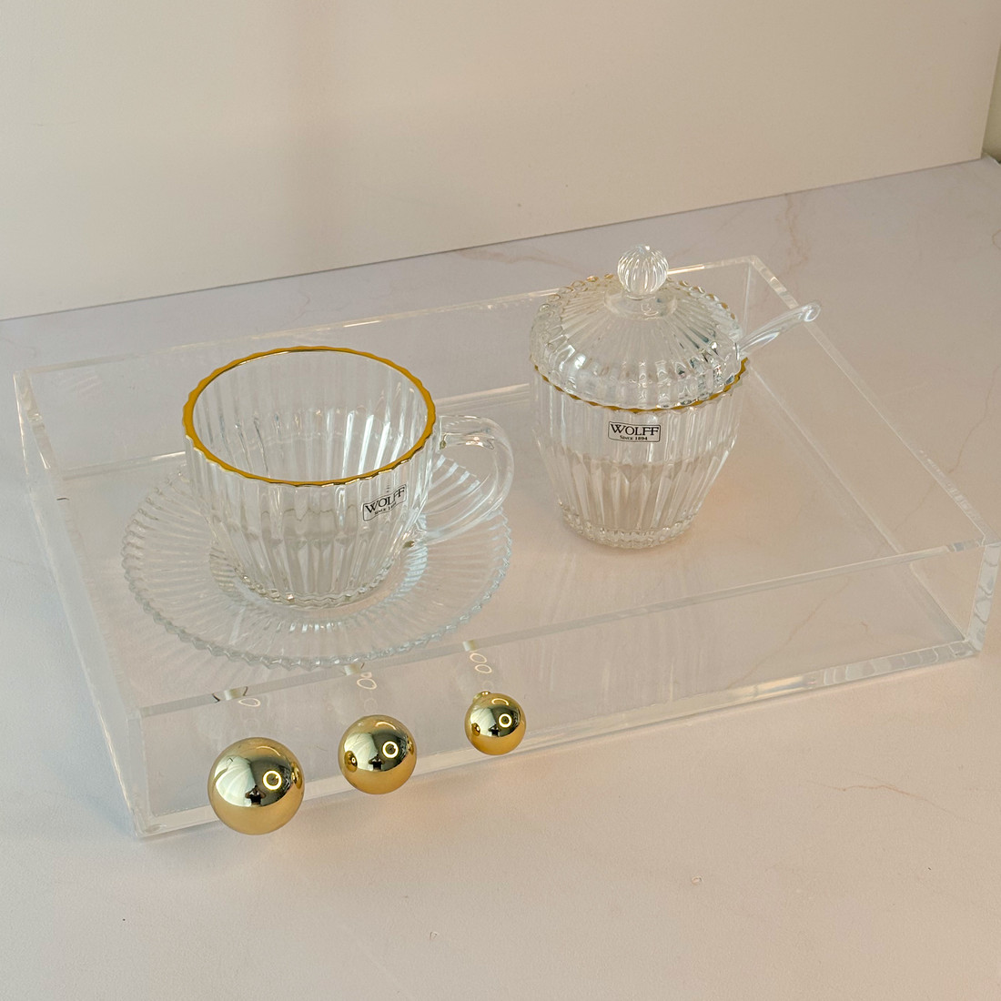 A Bandeja c/ Esferas Douradas combina o acrílico cristal de alta espessura com esferas metálicas douradas em um contraste sofisticado e atemporal. O visual “clean” valoriza o que está sobre ela, perfumes, velas, bebidas ou joias .. enquanto o brilho do dourado traz o toque de luxo que conversa com projetos contemporâneos e clássicos. Ideal para aparadores, banheiros com mármore, mesas de centro e bares residenciais.