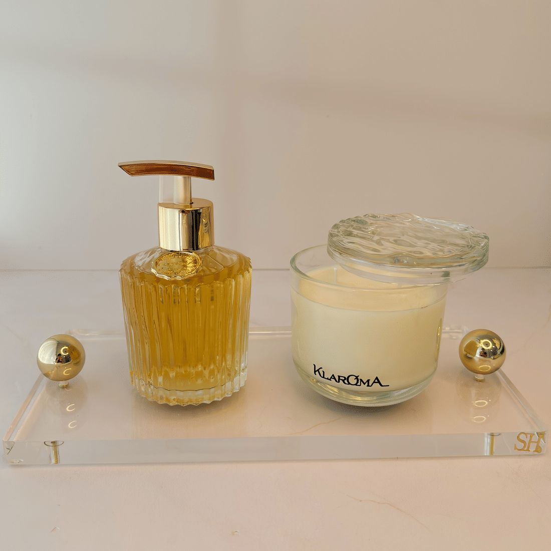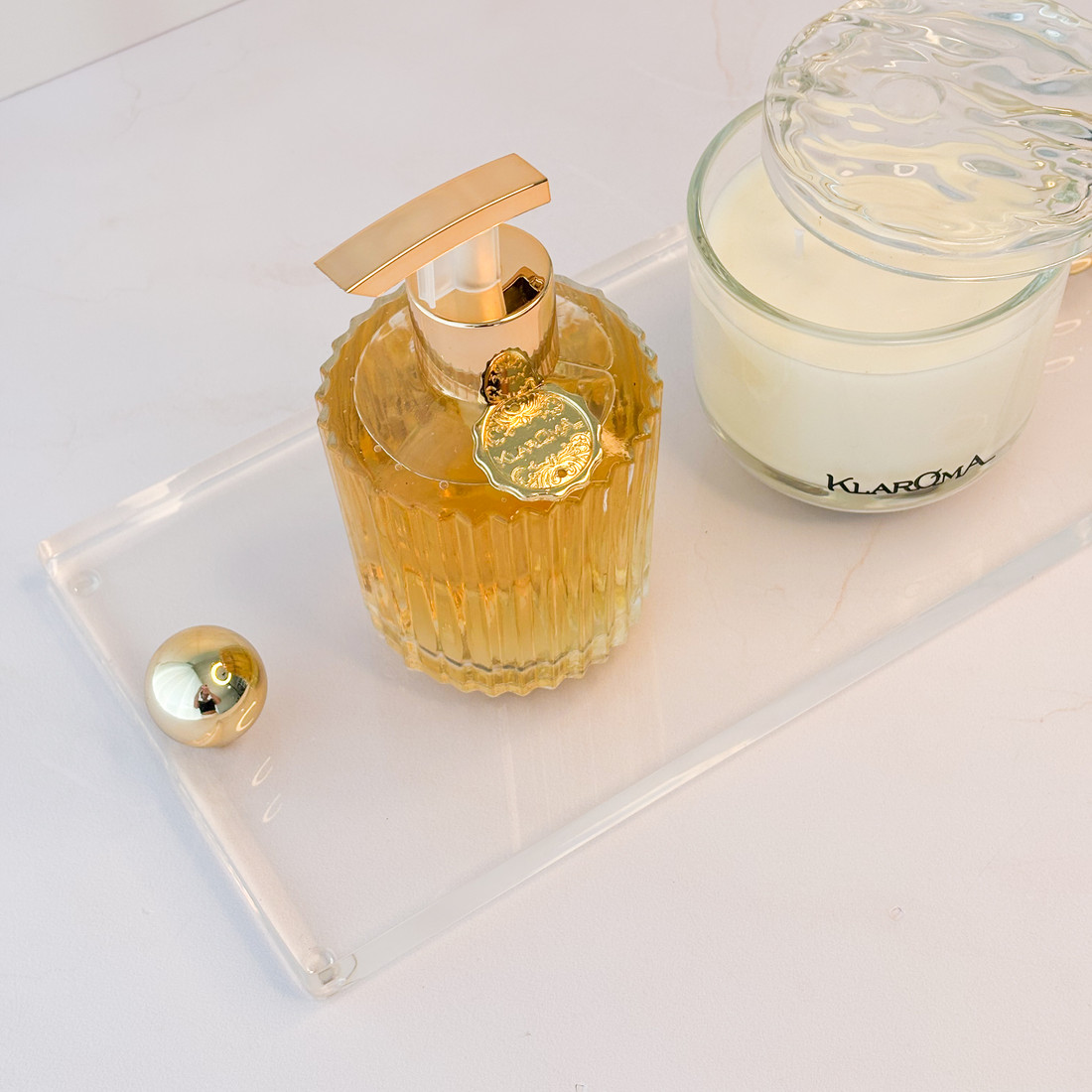 A Bandeja c/ Esferas Douradas combina o acrílico cristal de alta espessura com esferas metálicas douradas em um contraste sofisticado e atemporal. O visual “clean” valoriza o que está sobre ela, perfumes, velas, bebidas ou joias .. enquanto o brilho do dourado traz o toque de luxo que conversa com projetos contemporâneos e clássicos. Ideal para aparadores, banheiros com mármore, mesas de centro e bares residenciais.
