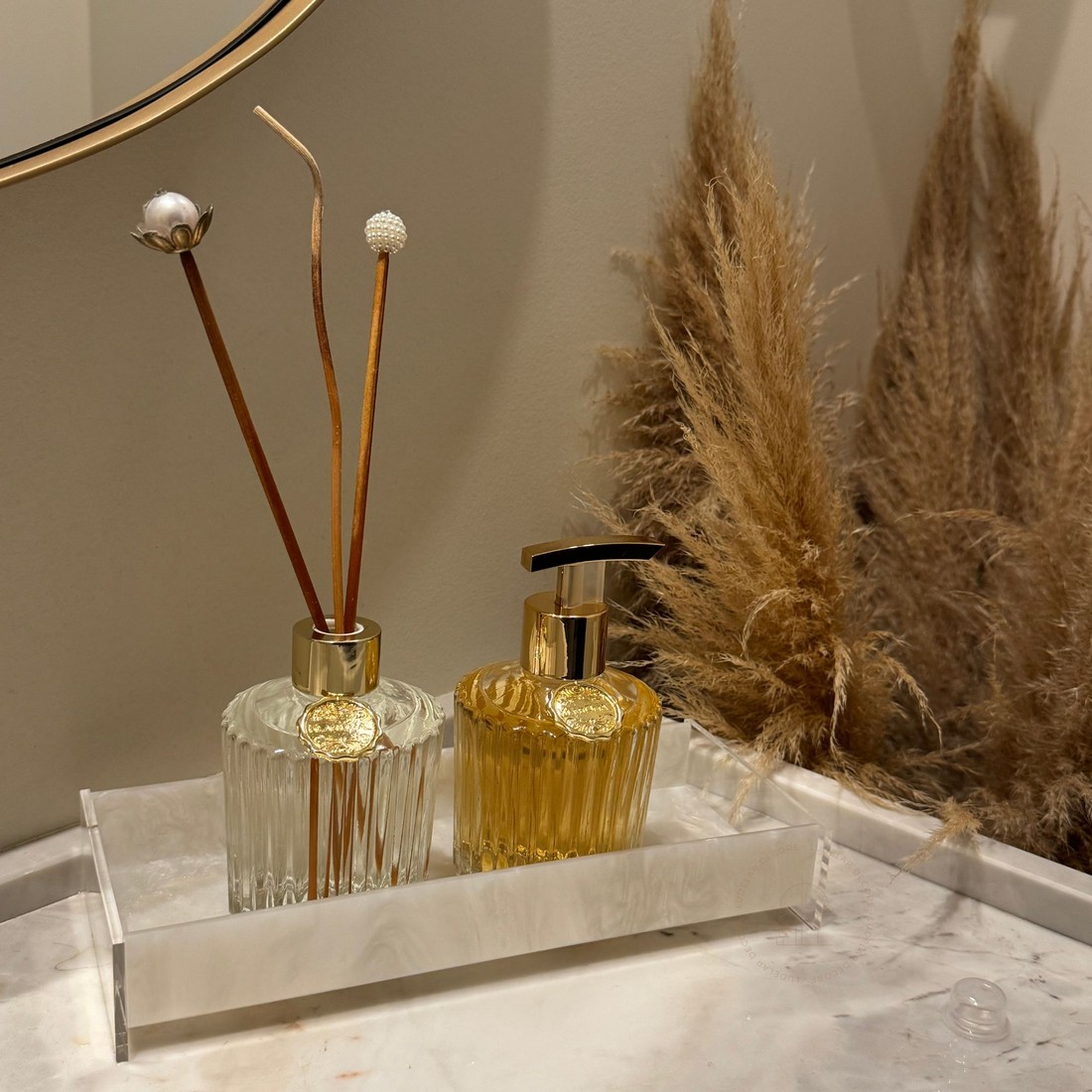 Aposte na Bandeja Retangular em Acrílico Pérola e transforme a organização do seu banheiro em um detalhe de puro charme e sofisticação.