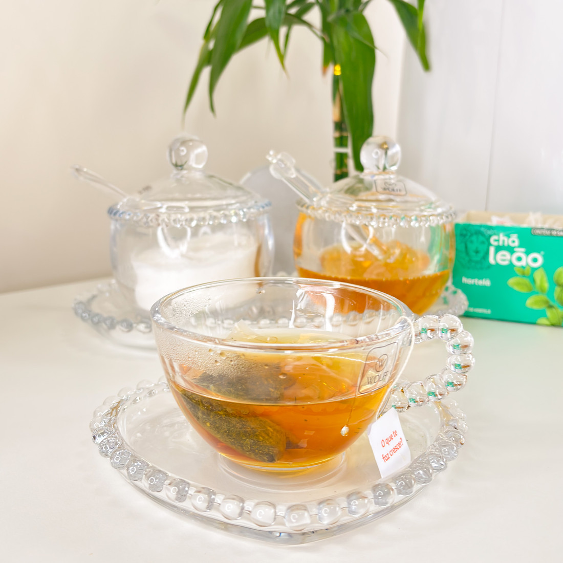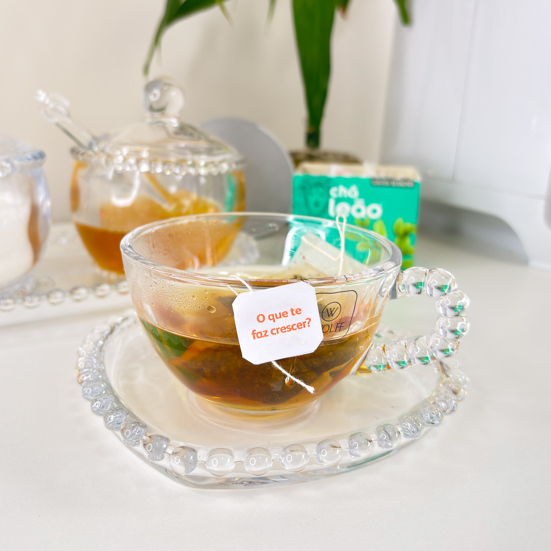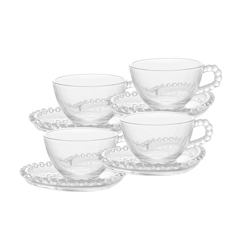 AdicionarConjunto com 4 xícaras de chá com pires em cristal Pearl, que encanta pelos detalhes elegantes e acabamento refinado. As xícaras transparentes valorizam a cor da bebida, enquanto o pires em formato de coração com borda de pérolas traz um toque romântico e sofisticado à mesa posta. Ideal para servir chá, café ou infusões com charme, seja no dia a dia ou em momentos especiais.