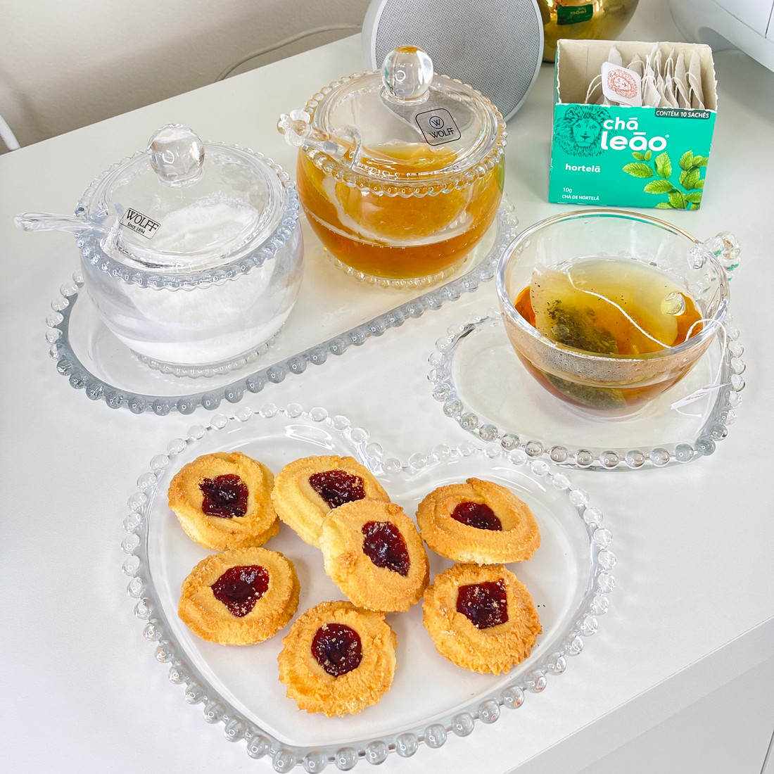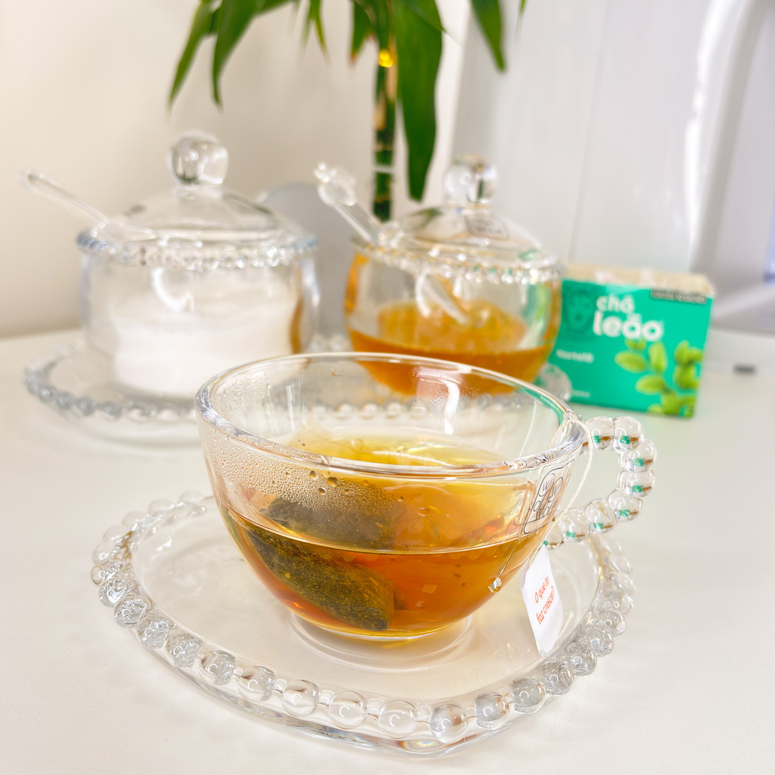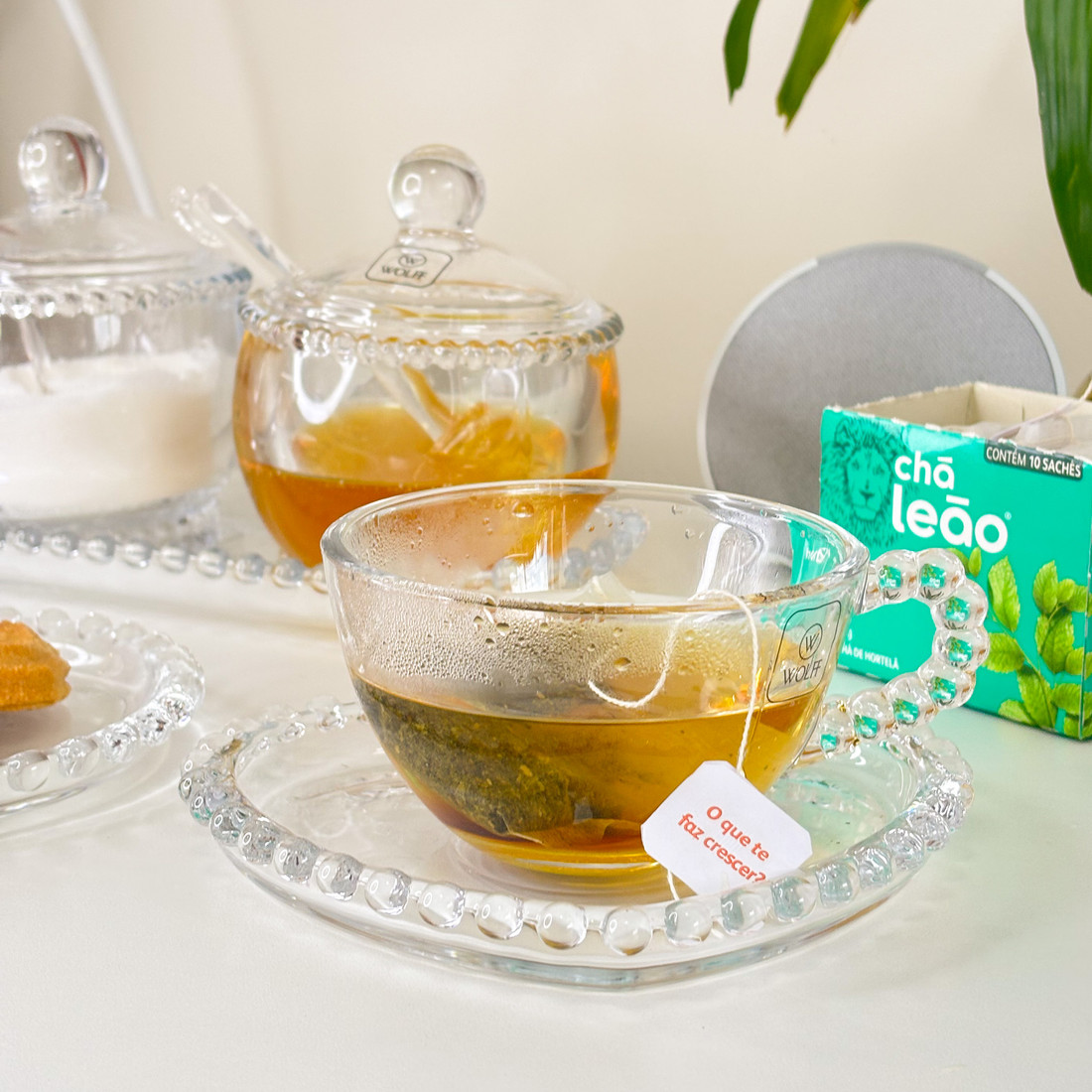 AdicionarConjunto com 4 xícaras de chá com pires em cristal Pearl, que encanta pelos detalhes elegantes e acabamento refinado. As xícaras transparentes valorizam a cor da bebida, enquanto o pires em formato de coração com borda de pérolas traz um toque romântico e sofisticado à mesa posta. Ideal para servir chá, café ou infusões com charme, seja no dia a dia ou em momentos especiais.