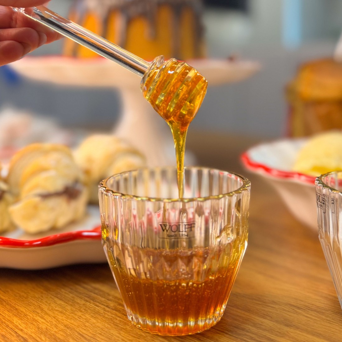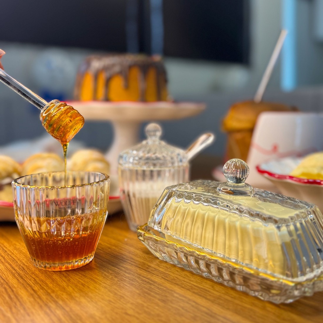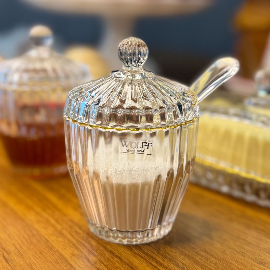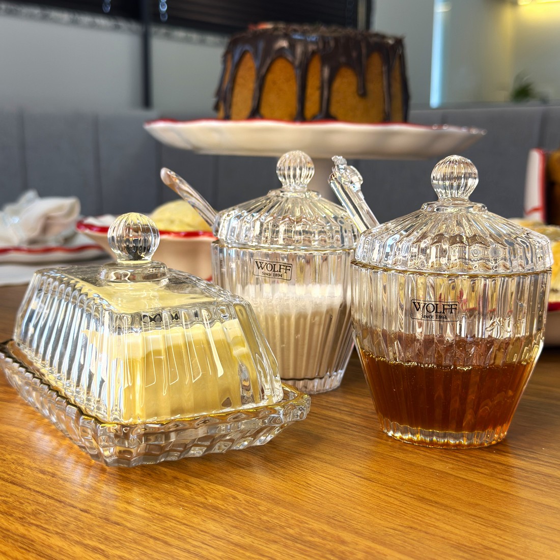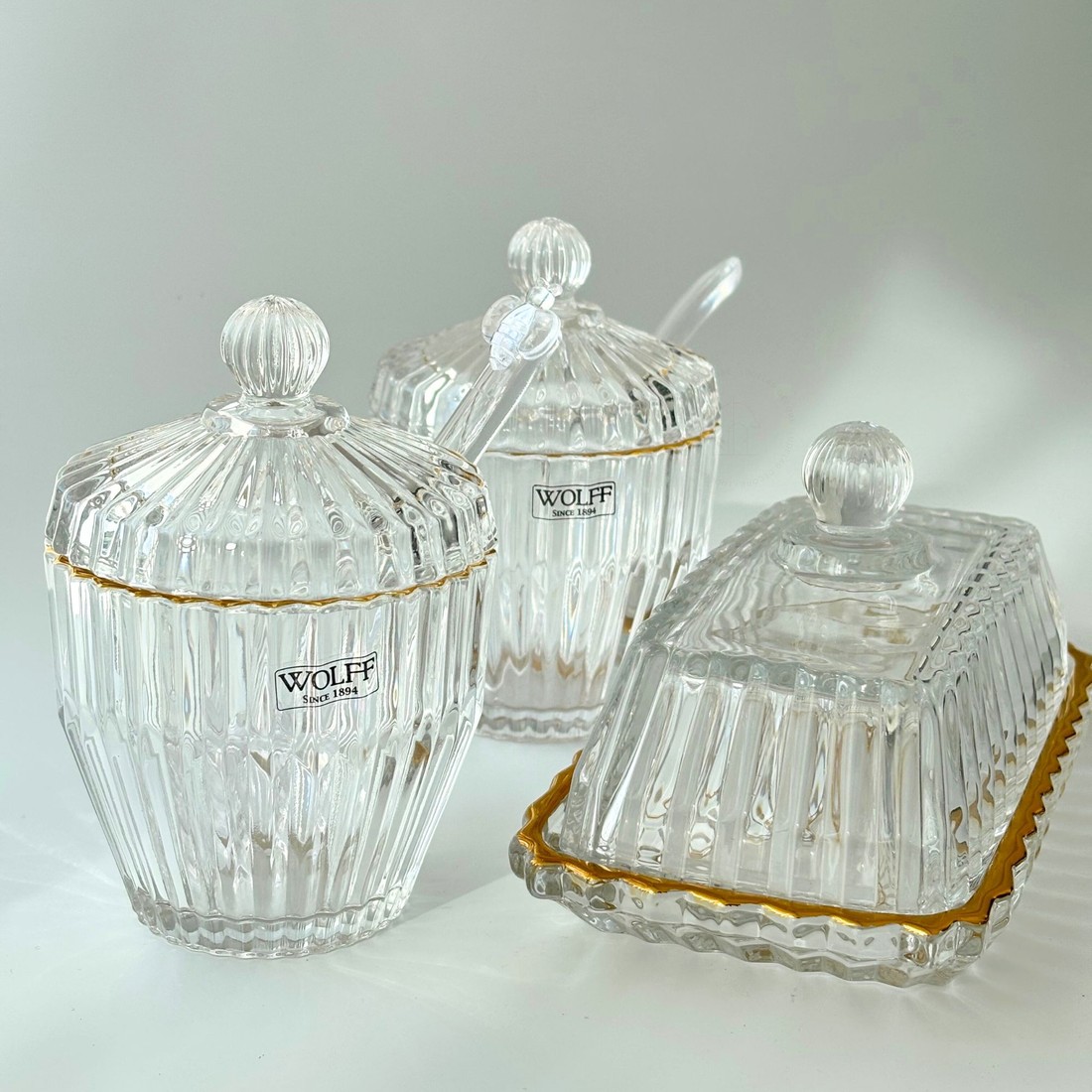 Elegância clássica para a sua mesa posta. O Conjunto Império da Wolff é composto por açucareiro, meleira e mantegueira, todos produzidos em vidro trabalhado com design facetado e acabamento em fio de ouro, que confere um toque sofisticado e atemporal.