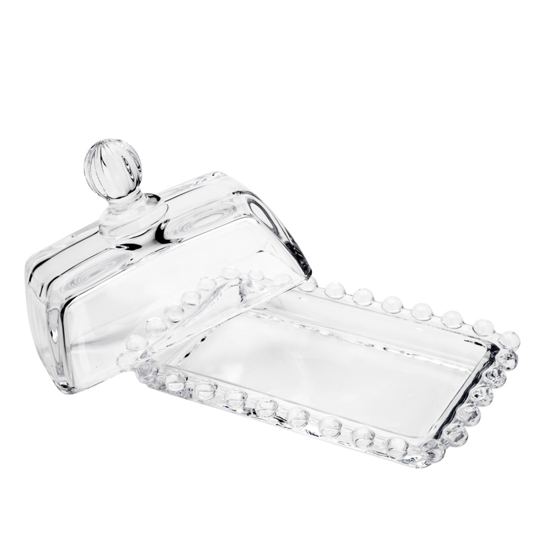 Produzida em cristal com acabamento em relevo no estilo pearl, a peça valoriza a apresentação e mantém a manteiga protegida, garantindo praticidade e organização à mesa.