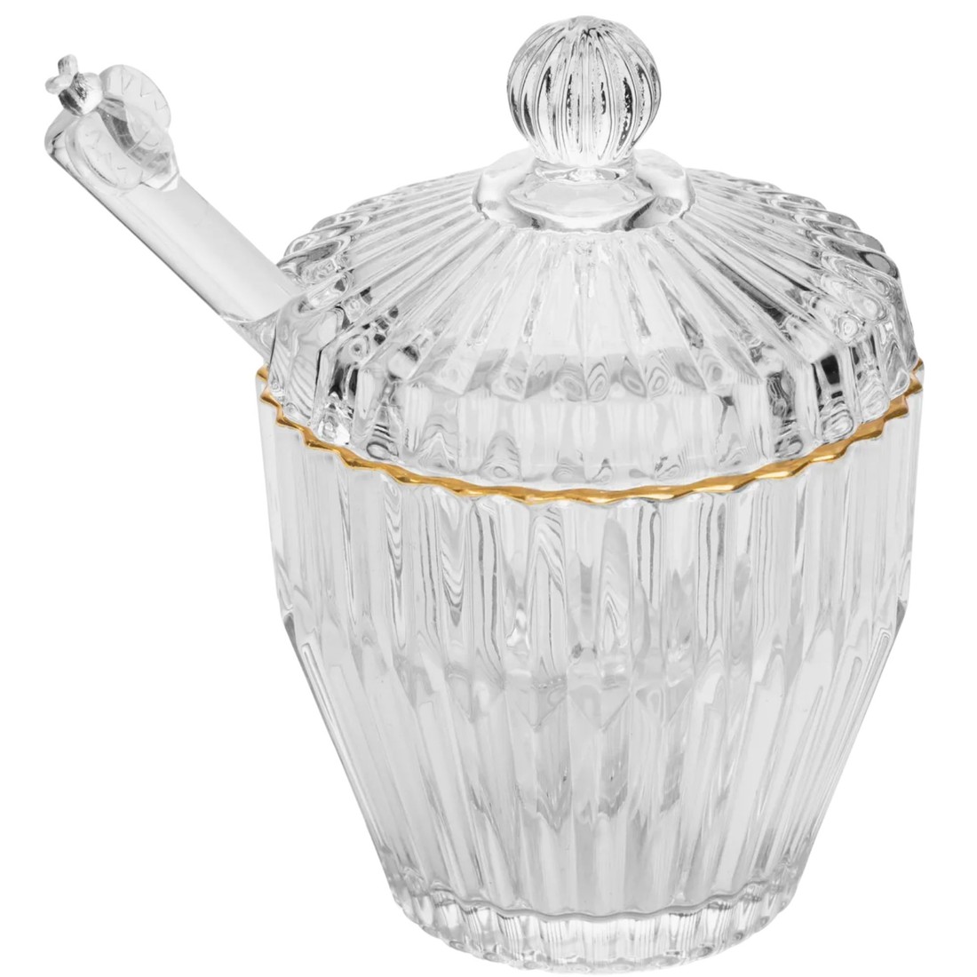 Sofisticação e praticidade para sua mesa. Esta meleira em cristal transparente conta com tampa e pegador, além do delicado fio de ouro na borda, garantindo um toque de luxo clássico. Ideal para servir mel com elegância, é perfeita para quem valoriza detalhes refinados na hora de compor a mesa.
